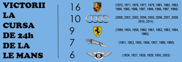 14. Audi a câştigat pentru a zecea oară la Le Mans, constructorul german ocupând astfel a doua poziţie în clasamentul all-time. Pe primul loc se află Porsche.