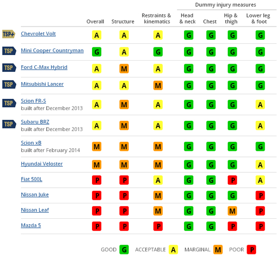 De cealaltă parte, alte patru modele prezente în Europa au primit calificativul "Slab" în urma testelor SOT. Este vorba de Fiat 500L, Nissan Juke, Nissan Leaf şi Mazda5. Cel mai slab comportament a fost înregistrat de monovolumul compact al japonezilor, care nu a trecut testul la patru din cele şase teme de testare. În cazul modelelor Nissan şi Fiat, structura habitaclului a avut de asemenea de suferit. "Leaf a înregistrat intruziuni de 40 de centimetri în zona inferioară a habitaclului şi de 35 de centimetri în zona superioară. Panoul de bord, pedala frânei de parcare şi coloana de direcţie au fost împinse spre şofer. Este foarte probabilă apariţia rănilor la nivelul genunchiului stâng şi a zonei inferioare a piciorului stâng în cazul unui accident de acest, iar rănirea zonei coapsei stângi este şi ea posibilă", se arată în comunicatul oficial IIHS.