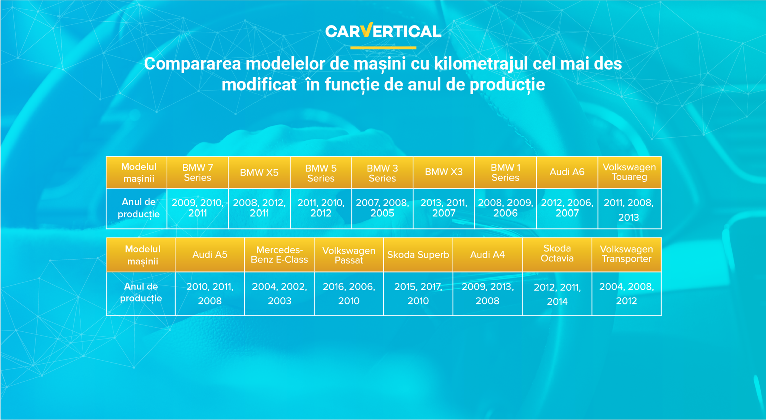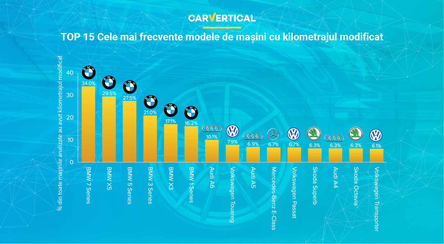 La nivelul tuturor țărilor analizate, cele mai multe mașini cu kilometrajul modificat fac parte din segmentul premium și sunt produse în Germania. De altfel, cele mai "fraudate" mașini la acest capitol sunt BMW Seria 7, BMW X5 și BMW Seria 5, în timp ce primul model non-premium apare abia pe locul 8 în dreptul lui Volkswagen Touareg.