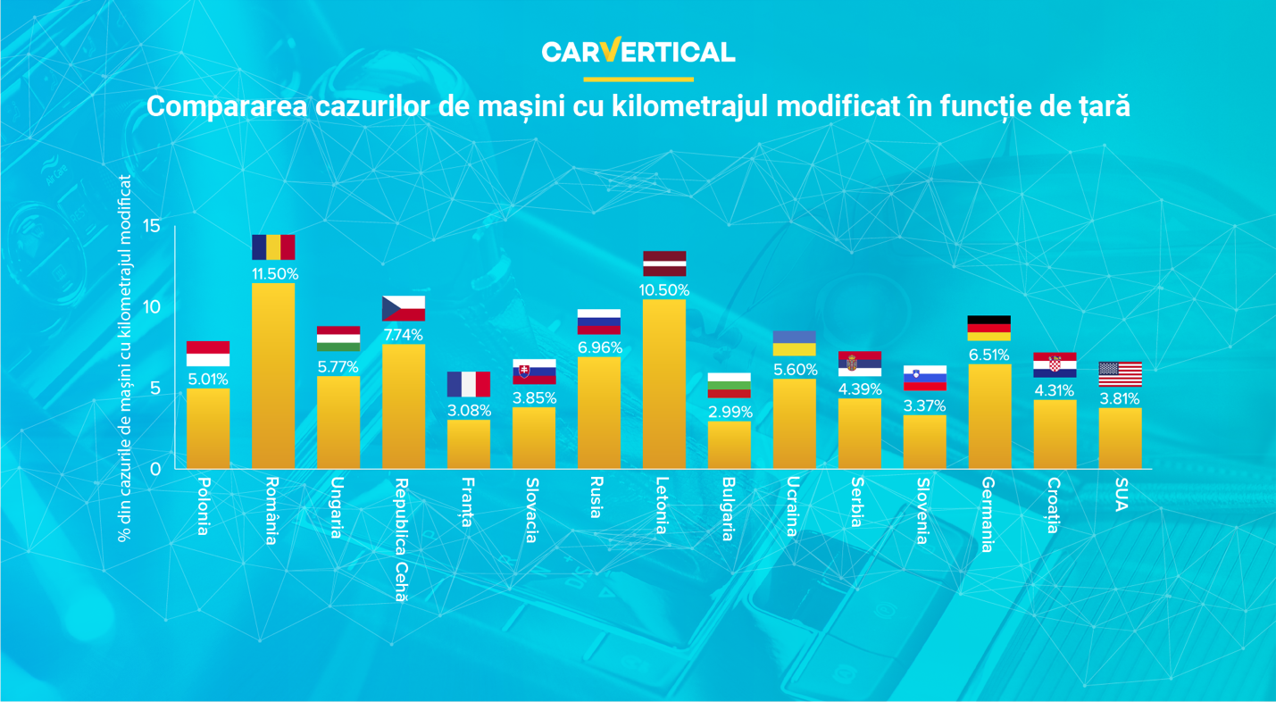 Pentru piața din România, analiza a scos în evidență că 11.5% dintre mașinile verificate au kilometrajul modificat. În plus, acesta este cel mai ridicat procent de fraudă pentru kilometraj dintre cele 15 țări analizate.