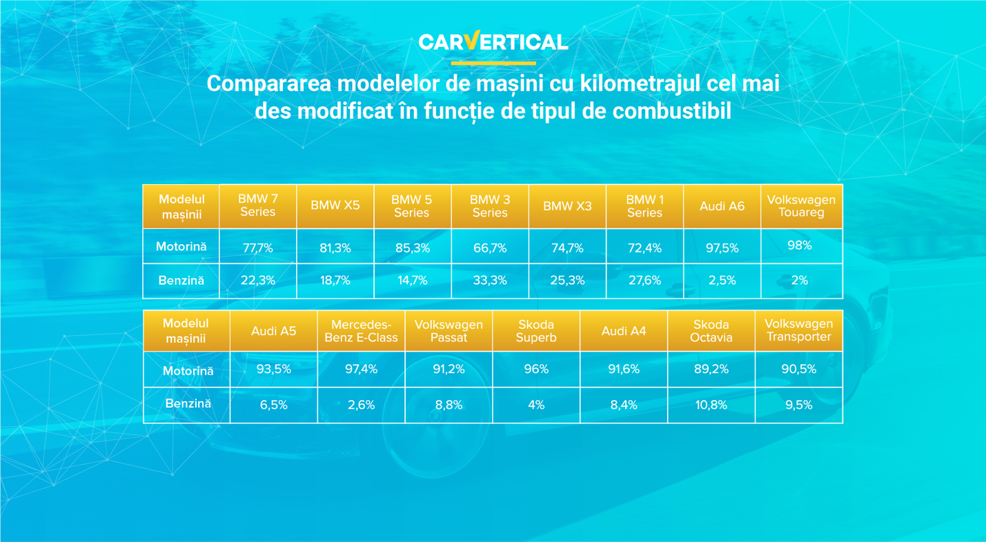 O altă statistică interesantă este că cea mai mare parte a mașinilor cu kilometri dați înapoi au motoare diesel. De altfel, în cazul unor modele precum Audi A6, Volkswagen Touareg și Mercedes-Benz Clasa E, aproape toate unitățile cu kilometrajul dat înapoi aveau motoare diesel.