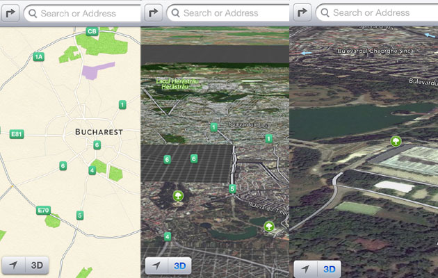 Utilizatorii români îşi vor dori probabil să fi locuit în Statele Unite, acolo unde viitoarea aplicaţie Maps va fi excelent pusă la punct. Pe lângă precizia indicaţiilor şi cantitatea imensă de informaţii, Maps mai scoate din mânecă un as. Este vorba despre posibilitatea de a vedea harta unor oraşe mari din SUA în format 3D. Un format 3D care va ajuta pe oricine să găsească adresa exactă cu mult mai mare uşurinţă. Funcţia 3D este extrem de fidelă terenului, însă, din păcate, nu poate fi folosită deocamdată în România.