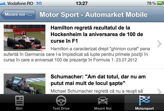 Pentru fanii Formula 1 sau WRC, Automarket aduce în aplicaţia sa pentru mobil şi toate ştirile din ”Motorsport”. Fluxul nostru editorial te ţine la curent cu ce se întâmplă zilnic în sporturile cu motor şi îţi oferă cronici pertinente, imediat după încheierea curselor.