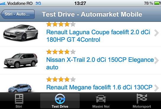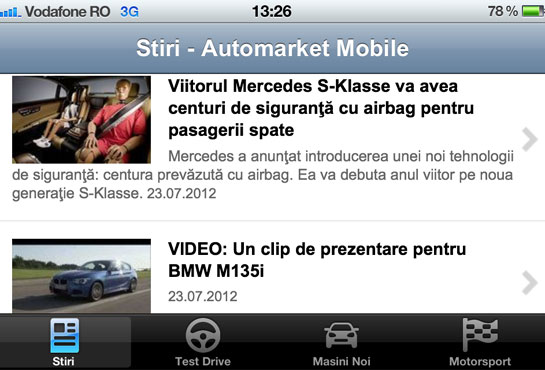 Automarket a lansat astăzi, alături de Vodafone, o aplicaţie pentru mobil. Ea este gratuită şi aduce publicului patru secţiuni: Ştiri, Test Drive, Maşini noi şi Motorsport.
