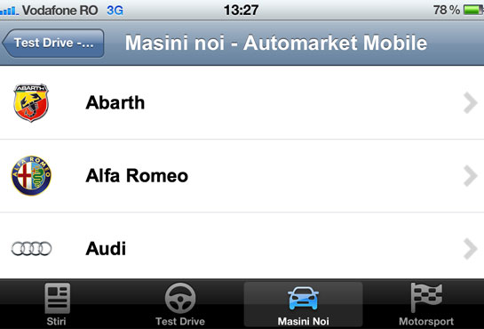 Automarket vine astfel mai aproape de cititorii săi cu principalele secţiuni ale site-ului, completând oferta editorială pe care o digeraţi zi de zi pe site. Aplicaţia Automarket conţine patru secţiuni principale ale portalului: Stiri, Test-Drive, Masini noi şi Motorsport.