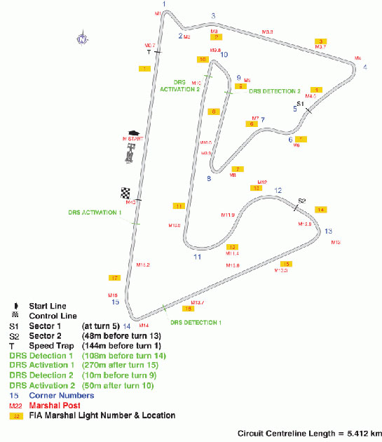 Spectacolul ar putea fi însă salvat de cele două zone DRS anunţate de FIA. Prima zonă DRS a fost poziţionată pe aproape toată lungimea liniei dreapte de start-sosire, cu punctul de detecţie situat înainte de intrarea în virajul 14. În schimb, a doua zonă DRS este amplasată pe toată lungimea liniei drepte dintre virajele 10 şi 11, cu punctul de detecţie înainte de intrarea în virajul nouă.