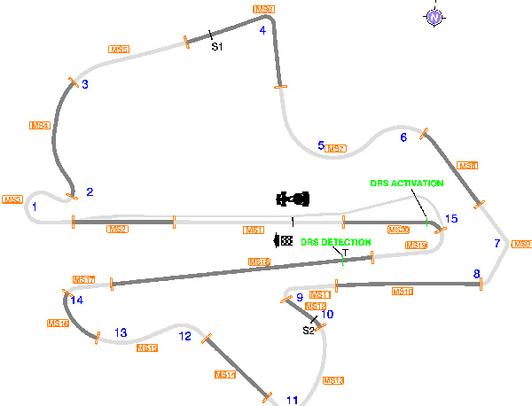 În cazul în care vremea va permite, piloţii vor putea activa sistemul Drag Reduction System (DRS) în cursa de duminică pe o singură zonă, care va începe imediat după ultimul viraj şi se va încheia la finalul liniei drepte de start-sosire. Practic, zona de depăşire este identică cu cea utilizată în cursa de anul trecut, singura diferenţă find mutarea zonei de detecţie înainte de intrarea în ultimul viraj.