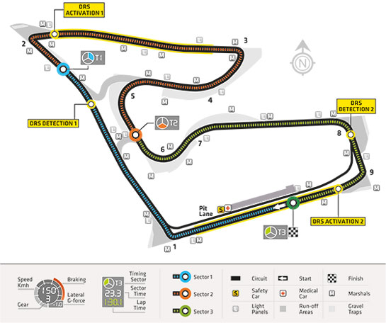 FIA a amplasat două zone de activare pentru sistemul DRS, însă niciuna dintre acestea nu este pe cea mai lungă linie dreaptă. Prima zonă de activare este poziţionată la 85 de metri după virajul 2, în timp ce a doua zonă începe la 110 metri după ieşirea din virajul nouă.
