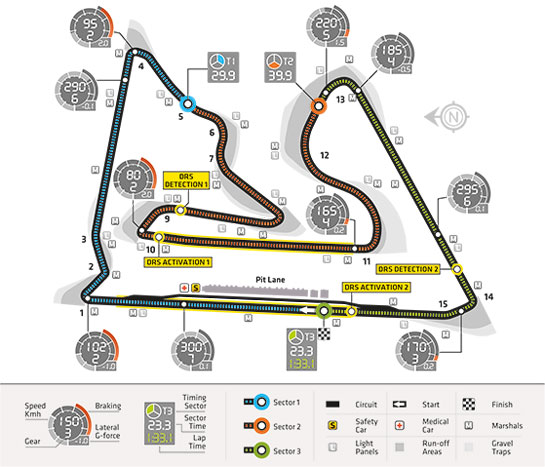 Regulamentul sistemului DRS a rămas identic cu cel de anul trecut: există două zone în care sistemul va putea fi activat, prima dintre ele fiind situată între virajele 10 şi 11, iar a doua pe lunga linie dreaptă de start-sosire.