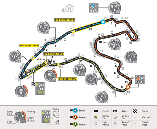 Conform aşteptărilor, piloţii vor avea la dispoziţie două zone în care vor putea activa sistemul DRS. Prima zonă a fost amplasată între virajele patru şi cinci, cu punctul de detecţie înainte de intrarea în virajul doi, în timp ce a doua zonă este între virajele 19 şi 20, cu detecţia înainte de virajul 18.