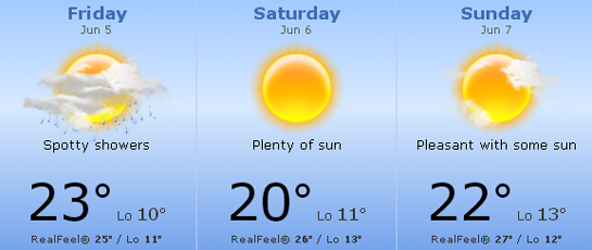 După temerile privind ploile de la Monaco, piloţii vor avea parte la Montreal de vreme semnificativ mai frumoasă şi mai caldă. Chiar dacă vineri se anunţă unele ploi răzleţe care ar putea afecta antrenamentele, sâmbătă şi duminică cerul va fi predominant senin, astfel că şansele de ploaie sunt minime. În plus, temperatura maximă va fi de 20 de grade în ziua calificărilor şi de 22 de grade duminica.