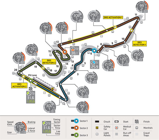 Cele mai bune oportunităţi de depăşire se află pe cele două zone DRS. prima dintre ele, similară cu cea de anul trecut, este situată între virajele 11 şi 12, cu punctul de detecţie situat înainte de intrarea în virajul 11. A doua zonă DRS, introduse în acest an, este poziţionată pe linia de start-sosire, cu punctul de detecţie înainte de intrarea în virajul 19.