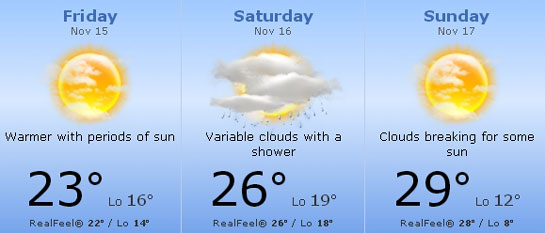 Vremea de la Austin este foarte capricioasă în acest moment. În această noapte s-au înregistrat temperaturi negative, însă vremea se va încălzi accelerat în cursul weekendului. De exemplu, joi se vor atinge maxim 17 grade, pentru ca vineri temperatura să urce până la 23 de grade. Sâmbătă, când există inclusiv unele şanse de ploaie pe parcursul zilei, vor fi maxim 26 de grade, iar duminică vremea va fi una tipică pentru vară, cu maxim 29 de grade.