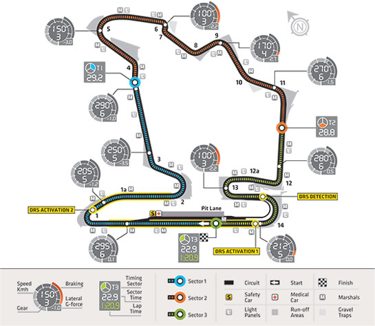 De altfel, la fel ca şi anul trecut, FIA încearcă să impulsioneze depăşirile prin stabilirea a două zone de depăşire DRS: prima este cea clasică, de pe linia de start-sosire, în timp ce a doua a fost amenajată chiar după ieşirea din primul viraj. Strategia pe care mizează forul mondial este că un pilot aflat la o secundă în spatele unui rival va avea posibilitatea să se apropie de acesta în prima zonă DRS şi să iniţieze un atac în a doua zonă DRS.