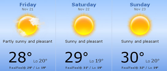 Poziţionarea în Orientul Mijlociu va oferi piloţilor o vreme călduroasă pe parcursul acestui weekend, iar scenariul se va repeta în fiecare dintre cele trei zile ale competiţiei: temperatura maximă va creşte progresiv de la 28 de grade Celsius vineri până la 30 de grade Celsius duminică, în timp ce temperatura minimă nu va coborî sub 19 de grade. În plus, cerul va fi complet senin în permanenţă, astfel că şansele de ploaie sunt nule.