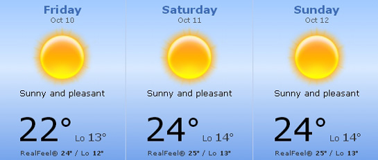 Potrivit serviciului AccuWeather, antrenamentele libere de vineri se vor desfăşura la o temperatură maximă de 22 de grade, în timp ce sâmbătă şi duminică se vor înregistra câte 24 de grade. Cerul va fi complet senin în fiecare dintre cele trei zile ale competiţiei.