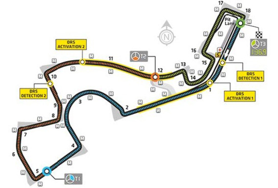 Piloţii vor avea la dispoziţie două zone în care vor putea activa sistemul DRS. Prima este amplasată între primele două viraje ale circuitului, cu punctul de detecţie imediat după linia de start-sosire, în timp ce a doua este poziţionată între virajele 10-12, cu punctul de detecţie înainte de virajul 10.