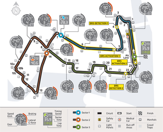 Întrucât depăşirile sunt dificile, momentul intrării la boxe va fi crucial, întrucât un pilot care revine pe traseu în spatele unui pilot lent va avea dificultăţi în a-şi recăpăta poziţia. Timpul petrecut pe linia boxelor este unul dintre cele mai mari de pe parcursul sezonului, întrucât viteza în pitlane-ul de 404 metri este limitată la numai 60 km/h.