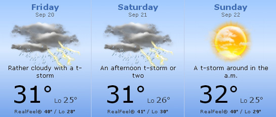 Prognoza actuala indică faptul că zilele de vineri şi sâmbătă vor fi afectate de câteva furtuni în cursul după-amiezelor, însă rămâne de văzut dacă acestea se vor opri până la ora începerii evenimentelor oficiale. O altă furtună este aşteptată pentru duminică dimineaţă, însă probabil că ploaia va ocoli cursa care va avea loc după lăsarea întunericului. Temperatura maximă în cele trei zile va fi de 31-32 de grade, iar cea minimă nu va scădea sub 25 de grade.
