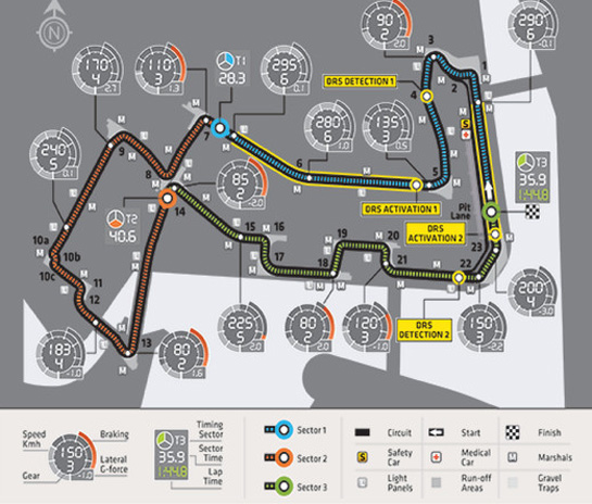 Ca de obicei, piloţii vor avea la dispoziţie două zone DRS pe circuit. Prima zonă DRS este cuprinsă între virajele cinci şi şase, cu punctul de detecţie înainte de virajul cinci, în timp ce a doua zonă de activare este pe linia dreaptă de start-sosire, cu punctul de detecţie amplasat înainte de intrarea în ultimul viraj.