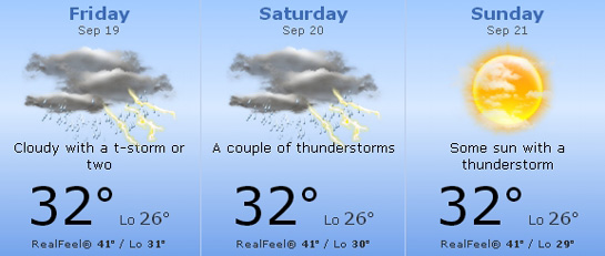 Umiditatea excesivă determină apariţia unor furtuni în fiecare dintre cele trei zile de concurs, însă cel mai probabil acestea vor ocoli calificările şi cursa, care se vor desfăşura după lăsarea întunericului.