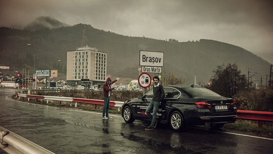 Între un „stop”, „acţiune” şi „reluăm”, platoul de filmare se mută în spatele unui volan inscripţionat cu logo-ul BMW, în faţa unui ecran de 10 inch pe care distingi chiar şi pista de aterizare a Aeroportului Otopeni, în scaunele albe în care vei amorţi pentru restul zilei. Decorul se derulează încet, extrem de încet.