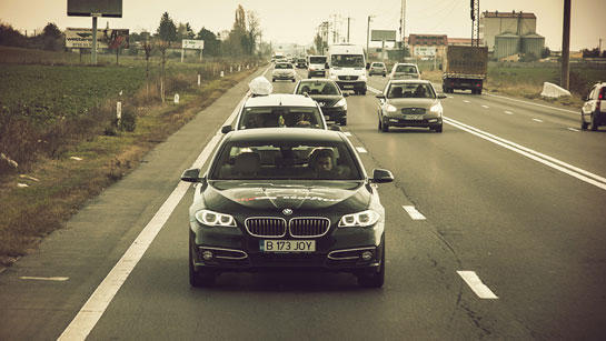 O coborâre lentă şi o coloană nesfârşită de faruri se adună încet, încet în oglinda lui 520d. Un cor de înjurături imaginare par să se contureze cu fiecare kilometru scurs între Predeal şi Sinaia. Aproape de Comarnic, câţiva curajoşi cedează nervos şi depăşesc. Curajos şi autocarul echipei de fotbal Gaz Metan Mediaş, care - după un set de faruri aruncate cu năduf în ceafa noastră - reuşeşte să depăşească în ţipătul exasperant al unui claxon. Sorry, băieţi...