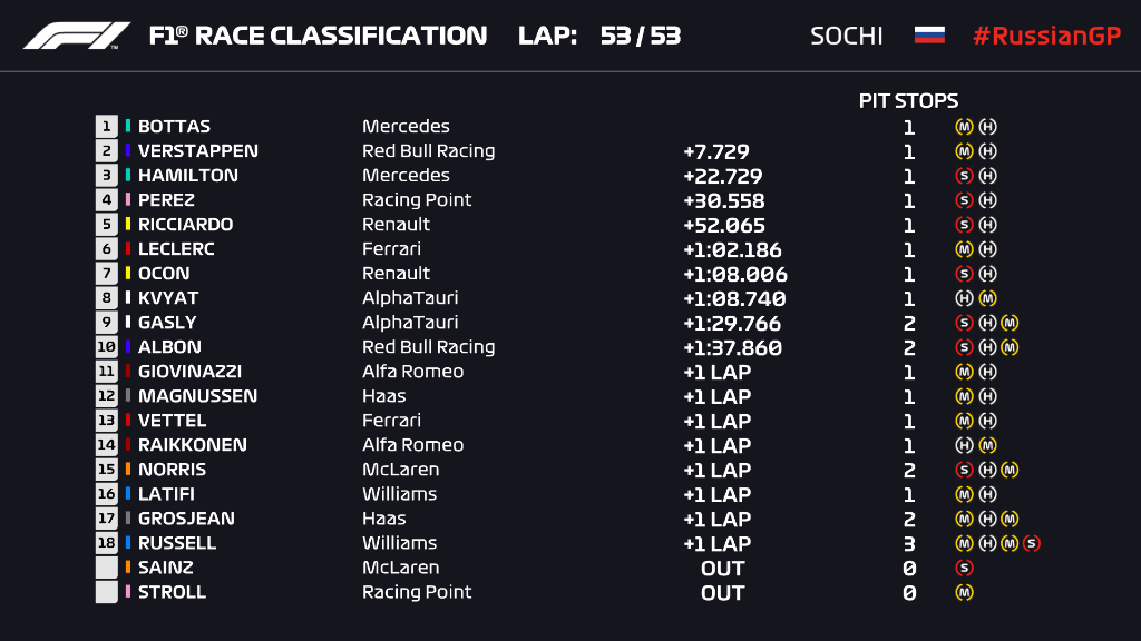 Bottas a câștigat cursa din Rusia în fața lui Verstappen! Hamilton, locul 3 după o penalizare de 10 secunde