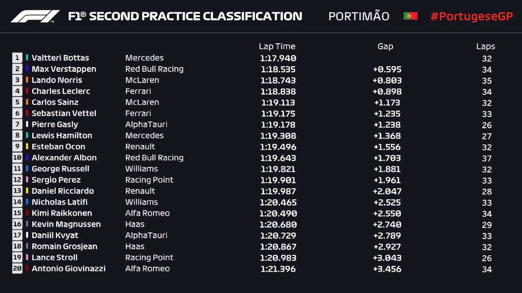 În a doua sesiune, Bottas și-a îmbunătățit timpul și a fost cronometrat cu 1:17.940, iar de data aceasta locul doi i-a revenit lui Verstappen, la aproape șase zecimi în spate.