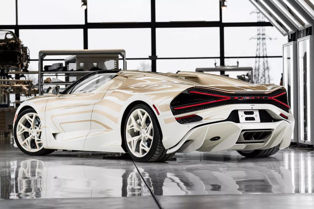 Așadar, vei observa o nuanță caldă cu inserții aurii pentru partea superioară și un alb cald rafinat pentru zona inferioară a caroseriei. Bugatti precizează că liniile de separație alb-auriu au necesitat mascări și vopsiri manuale extrem de minuțioase, procesul durând sute de ore.