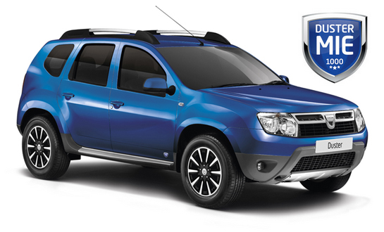 Pentru a celebra atingerea bornei 1000, Ness Motors - dealer care are trei puncte de vânzare în Scoţia - a scos pe piaţă şi o ediţie specială a lui Duster. Denumită oficial Dacia Duster MIE şi bazată pe versiunea ante-facelift a lui Duster, cea care se comercializează încă în Albion, versiunea vine cu toate elementele de care dispune facelift-ul SUV-ul românesc, implicit cu navigaţie MediaNAV şi touchscreen de 7 inch şi Bluetooth integrat, plusând cu o nuanţă inedită pentru Duster, Albastru Caspian, jante speciale de 16 inch în două nuanţe, scaune acoperite cu piele cenuşie, geamuri fumurii pe spate, senzori de parcare vopsiţi în culoarea caroseriei şi sigle MIE. Vor exista doar 20 de exemplare Dacia Duster MIE în Marea Britanie şi toate vor fi vândute de Ness Motors.