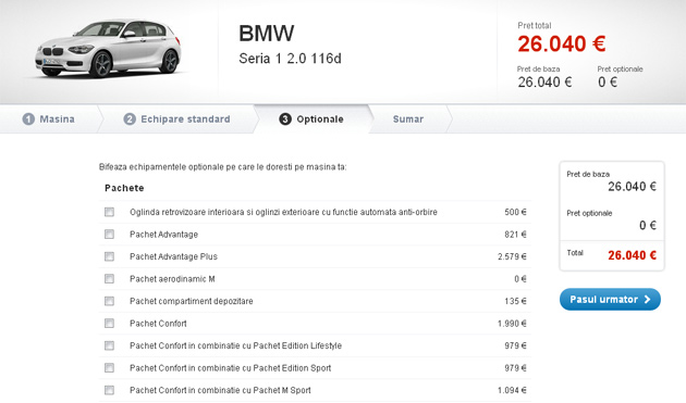 Baza de date pe care am clădit-o pentru tine este actualizată zilnic şi include absolut toate informaţiile de care ai nevoie. De la modelul dorit, la versiune, la nivel de echipare şi opţionale. La fel ca pe site-urile oficiale ale mărcilor, configuratorul te pune în faţă cu pachetele speciale şi cu preţurile aduse la zi ale tuturor opţionalelor. Evident, excluziunile şi incluziunile opţiunilor (de exemplu, dacă alegi piele pe scaune îţi sunt limitate opţiunile de nuanţe pentru acestea) fac şi acestea parte din pachetul oferit gratuit de Configuratorul Automarket.