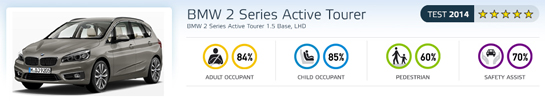 Primul monovolum BMW şi primul model cu tracţiune faţă a mărcii germane, Seria 2 Active Tourer, s-a dovedit o maşină reuşită din punctul de vedere al siguranţei la testele EuroNCAP. Noul model de familie al mărcii bavareze a adunat rating-ul maxim, cinci stele, cu punctaje bune la capitolele Pasageri Adulţi (84%) şi Pasageri Copii (85%), în timp ce Pietonii şi Sisteme de Siguranţă au fost notate cu 60%, respectiv 70% din punctele maxime posibile la aceste categorii. BMW Seria 2 Active Tourer este una dintre foarte puţinele modele testate de EuroNCAP care primeşte nota maximă la testul de impact lateral cu stâlpul, un Călcâi al lui Ahile pentru multe maşini din segmente superioare, însă este depunctat pentru că asigură o protecţie marginală la nivelul zonei inferioare a picioarelor şoferului la impactul frontal. Deşi există ca opţiune, sistemul care avertizează la părăsirea benzii nu a fost notat de EuroNCAP din cauza faptului că acesta nu va fi comandat pe majoritatea maşinilor vândute de BMW.