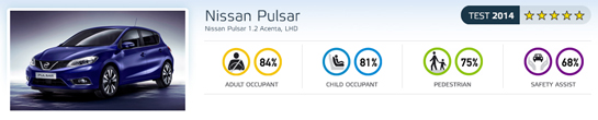 Una dintre apariţiile inedite ale industriei auto europene în această toamnă, noul Nissan Pulsar - rival în zona hatchback-urilor compacte cu Golf, Focus şi Megane - a reuşit şi el să adune cinci stele EuroNCAP după ce testele de siguranţă au reliefat un comportament bun la capitolele Pasageri Adulţi (84%) şi Pasageri Copii (81%). Protecţia Pietonilor a fost notată cu 75%, în timp ce Sistemele de Asistenţă au primit 68% din punctajul potenţial maxim. Pulsar s-a comportat bine la majoritatea testelor de impact, singura zonă în care modelul Nissan a fost notat ca mediocru fiind protecţia la nivel cervical a pasagerilor din faţă. la capitolul Sisteme de Siguranţă, Pulsar a fost privat de punctajele pe care le-ar fi putut primi pentru sistemul de frânare automată în oraş şi pentru cel de avertizare la părăsirea benzii. Ambele sunt disponibile ca opţiuni pe modelul japonez, însă nu au fost luate în calcul pentru că nu vor fi prezente pe majoritatea maşinilor vândute de marca niponă.