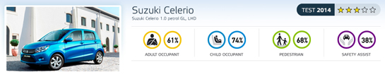 Suzuki Celerio, cel mai nou model din gama mărcii japoneze şi înlocuitorul lui Alto în segmentul mini, a primit trei stele EuroNCAP. Punctajul slab se datorează mai ales faptului că modelul nipon nu a primit puncte pentru testul de impact lateral cu stâlpul, EuroNCAP notând că airbag-urile laterale sunt doar pţionale pe acest model. Celerio a primit astfe doar 61% dintre punctele totale posibile la Protecţia pasagerilo Adulţil, fiind de asemenea depunctat pentru protecţia foarte slabă la nivel cervical pentru pasagerii din spate în cazul unui impact posterior. La capitolul Sisteme de Asistenţă, Celerio nu a fost punctat la trei dintre cele cele zone de punctare: limitatorul de viteză, avertizor la părăsirea benzii şi sistem de frânare automată, toate cele trei lipsind din dotarea modelului japonez.