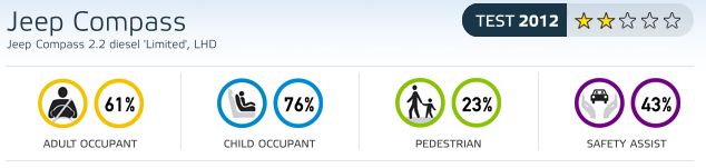 Jeep Compass a dezamăgit la testele EuroNCAP în cadrul mai multor categorii. Modelul american a fost testat cu un set de airbag-uri laterale pentru torace oferite opţional, dar acestea n-au reuşit să îmbunătăţească punctajul modelului per ansamblu. Cel mai dezamăgitor test a fost cel de impact lateral cu un stâlp, unde modelul a oferit un nivel slab de protecţie. La nivelul protecţiei pietonilor, Compass a primit doar 23 procente din totalul punctelor disponibile.