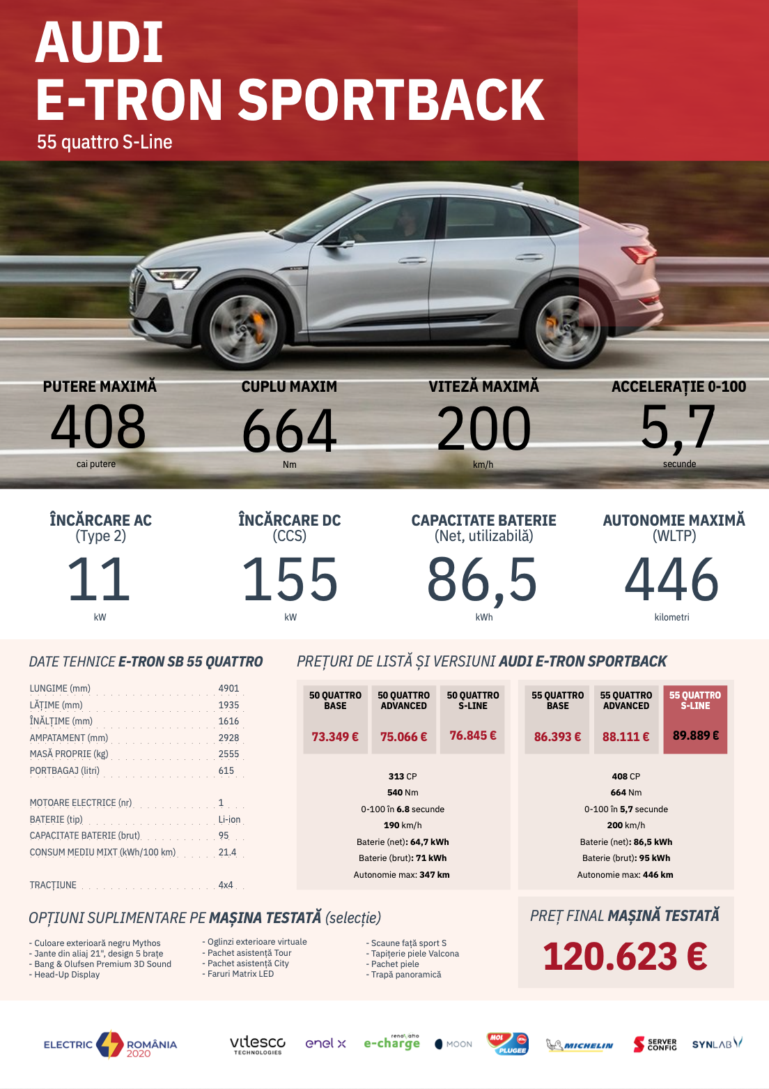 Pe piața din România, prețul de pornire al lui e-tron Sportback este de 73.349 de euro pentru versiunea 50 Quattro cu nivelul de echipare Base. În cadrul turului Electric România 2020, vom avea la dispoziție versiunea de top a modelului german: 55 Quattro S-Line, care are un preț de pornire de 89.889 de euro.