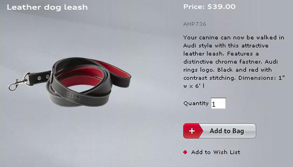 Să începem cu Audi. Crezi că noul tău câine nu este destul de stilat? Îi poţi cumpăra o zgardă cu emblema cu patru cercuri. Costă doar 39 euro şi poate fi comandată de pe magazinul online al mărcii germane. Câinele tău îţi va fi pe veci recunoscător.