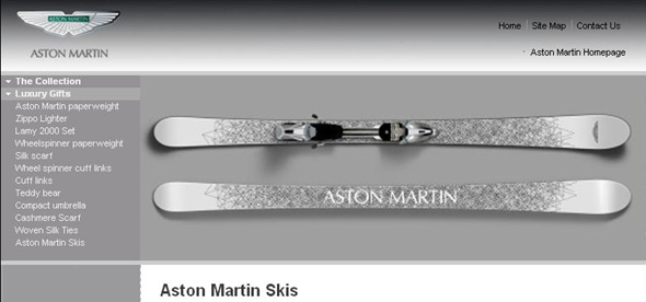 Urmează apoi un set de schiuri argintii marca Aston Martin. Sunt fabricate de specialistui austriac Differences şi pot fi comandate în culorile Aston Martin: alb morning frost, argintiu quantum, verde almond şi silver blonde. Sunt disponibile în patru mărimi şi pot fi comandate cu sau fără legături. Preţul nu este comunicat, deoarece skiurile Aston Martin sunt articole cu regim special în magazinul online Aston Martin.