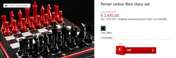 Să trecem la activităţi mai intelectuale. Poate avem chef de o partidă de şah. Şi nu ne mai plac tabla şi figurinele cumpărate la Eforie Nord în 1987. Ferrari ne oferă alternativa. Costă "doar" 1.450 euro plus taxe de transport. Piesele sunt roşii şi negre, iar tabla este făcută din lemn acopert cu fibră de carbon. Pătrăţelele de pe tablă sunt din fibră de carbon, respectiv fibră de sticlă. Pentru a putea juca şah la cel mai înalt nivel tehnologic.
