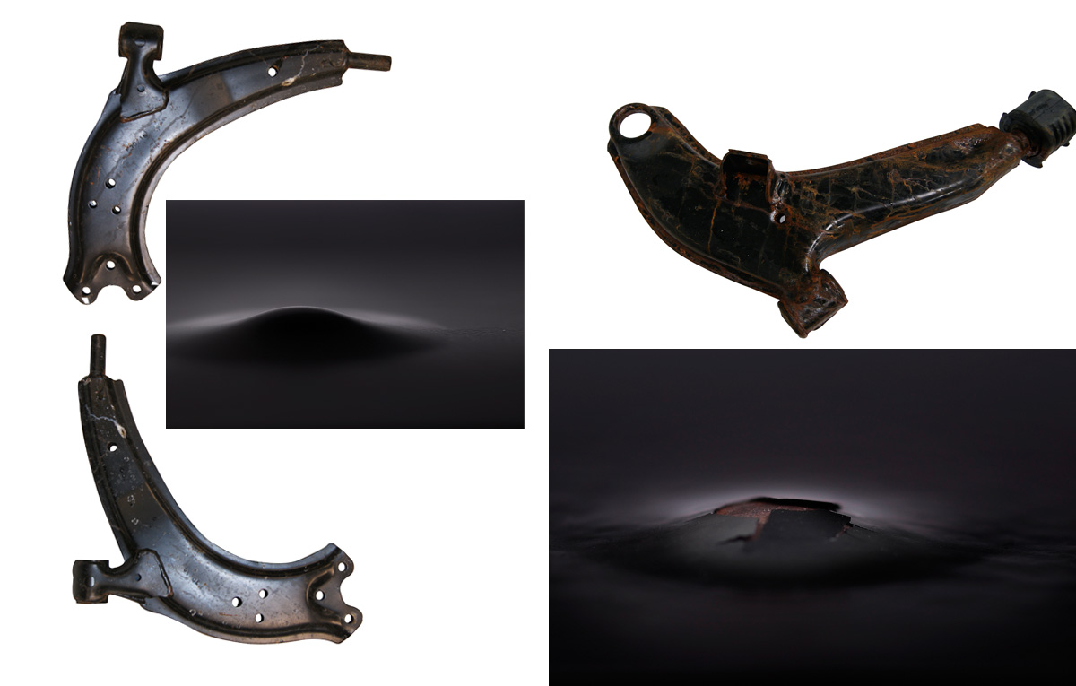 În dreapta - braţ suspensie din tablă, vopsit prin pulverizare electrostatică, testat 240 de ore în incintă cu ceaţă salină. Fond negru, acelaşi braţ, suspus la aceeaşi forţă ca braţul vopsit prin cataforeză.