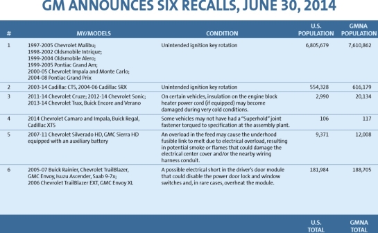 General Motors a anunţat şase acţiuni de recall în SUA în cadrul aceluiaşi comunicat, dintre care cel mai mare afectează 7.6 milioane de unităţi. În total, americanii au anunţat că vor chema în service pentru reparaţii 8.4 milioane de maşini.