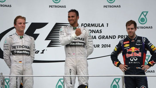 Lewis Hamilton a câştigat detaşat Marele Premiu al Malaysiei în faţa coechipierului său Nico Rosberg, care l-a depăşit la start pe Sebastian Vettel. Daniel Ricciardo a impresionat in debut, dar a terminat ultimul după o avalanşă de probleme generată de o eroare a mecanicilor la boxe.