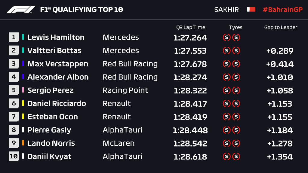 Lewis Hamilton va pleca din pole position în Bahrain din fața lui Valtteri Bottas, în timp ce Red Bull a monopolizat a doua linie prin Max Verstappen și Alexander Albon. Ferrari a fost eliminată cu ambii piloți în Q2.