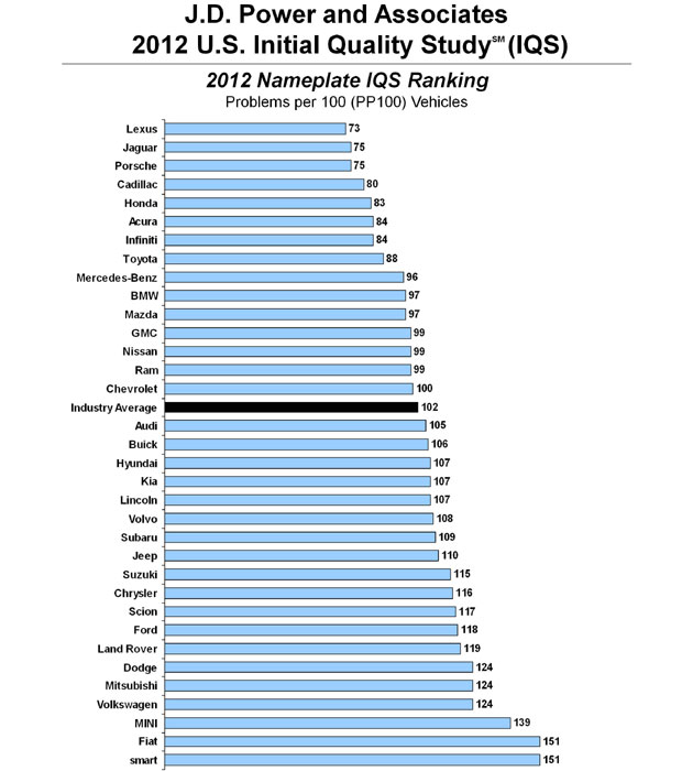 J.D. Power a publicat şi în acest an în SUA studiul anual botezat ”Initial Quality Scores”, care urmăreşte satisfacţia cumpărătorilor în primele 90 de zile de la achiziţionarea unui automobil nou. Statistica se construieşte în fiecare an pe problemele raportate de proaspeţii clienţi în primele trei luni şi include toate mărcile vândute pe piaţa din SUA.