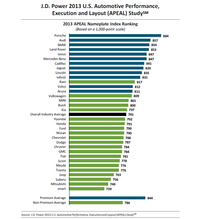 JD Power a publicat rezultatele ediţiei cu numărul 18 al studiului APEAL (Automotive Performance, Execution and Layout). Acest studiu evaluează cât de dorite sunt vehiculele oferite la vânzăre în Statele Unite ale Americii, folosind un algoritm cu 77 de atribute şi generând un scor de până la 1.000 de puncte.