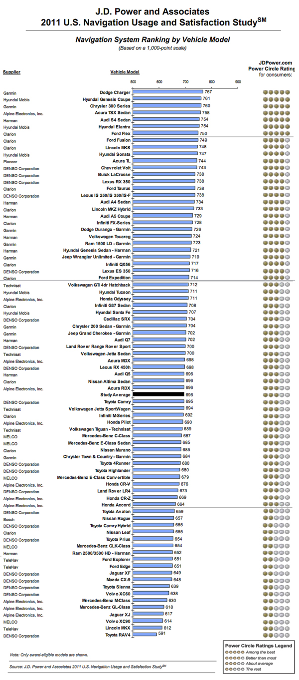 Americanii de la JD Power au publicat rezultatele pe 2011 ale studiului de satisfacţie care vizează sistemele de navigaţie standard oferite de constructorii care operează pe piaţa din Statele Unite ale Americii. Aparent, utilizatorii sunt frustaţi de lipsa de precizie de care dau dovadă aceste unităţi, de dificultatea introducerii unei adrese şi de alte probleme, cum ar fi imposibilitatea de a găsi o stradă sau o adresă. Cei de la JD Power au compilat nemulţumirile într-o listă, mai precis un studiu de satisfacţie a utilizatorilor. Modelele aflate în partea superioară a listei s-au descurcat cel mai bine, în timp ce modelele din partea inferioară a listei au avut cele mai slabe rezultate.