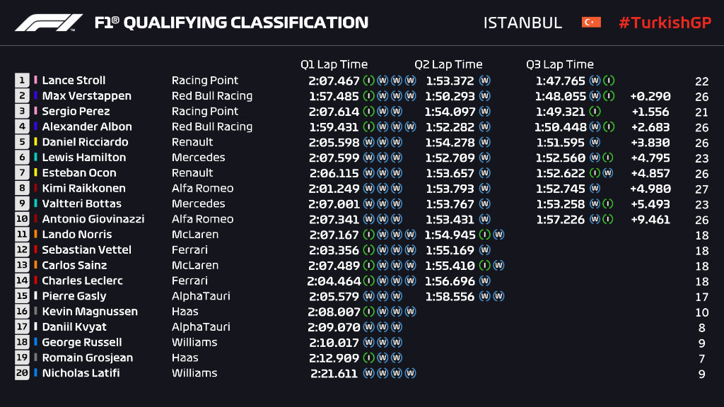 Lance Stroll a obținut un pole position surprinzător pe ploaie pe circuitul de la Instanbul în fața lui Max Verstappen. Lewis Hamilton a încheiat calificările doar pe locul 6, în timp ce Ferrari nu a intrat în top 10.
