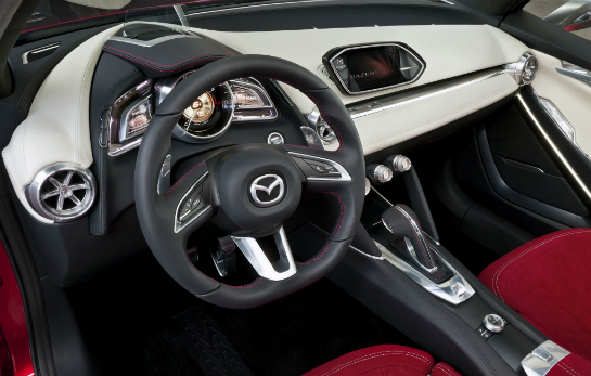 În comparaţie cu conceptul din imaginile alăturate, versiunea de serie va primi un interior mai temperat, cel mai probabil fără scaunele de culoare roşie, cu un set de ceasuri de bord inspirate din cele ale lui Mazda3, o altă planşă de bord şi comenzi de climatizare diferite. La nivelul exteriorului, ne aşteptăm la alte jante, oglinzi laterale mai cuminţi în materie de design, blocuri optice restilizate şi spoilere cu un nivel de agreisivitate mai redus.