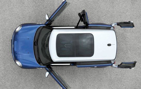 Vechiul Clubman de la Mini avea o singură portieră pe partea şoferului, portiere duble pe partea pasagerului şi un hayon cu deschidere dublă. Conceptul întrerupe tradiţia şi prezintă două portiere pe ambele părţi, în timp ce hayonul păstrează cele două uşi care l-au consacrat. Fişa tehnică, zgârcită în detalii, anunţă patru portiere şi cinci locuri. Ştim că noul Mini hatchback va avea şi o versiune cu cinci portiere, cu tot cu hayon, care le-ar permite britanicilor să păstreze experimentul Clubman pentru cei care-s "funky până-n măduva oaselor", ceilalţi având la dispoziţie fie hatchback-ul, fie SUV-ul Countryman.